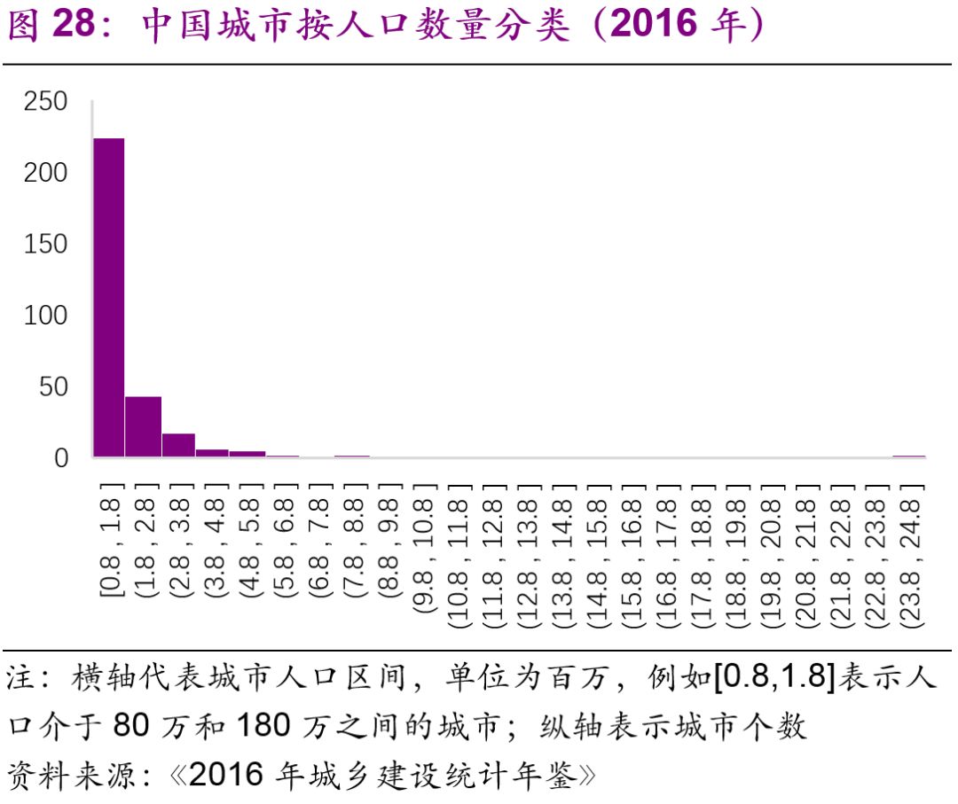 擬建地鐵、輕軌線路初期客運強度分別不低于每日每公里0.7萬人次、0.4萬人次,遠期客流規(guī)模分別達到單向高峰小時3萬人次以上、1萬人次以上。但是同時也強調(diào)了:“以上申報條件將根據(jù)經(jīng)濟社會發(fā)展情況按程序適時調(diào)整。”2016年,中國城市中市區(qū)常住人口在150萬以上的城市共有111個,對比目前已經(jīng)開通軌道交通的城市數(shù)量(34個),仍有一定的發(fā)展空間。而從國際上看,建設(shè)軌道交通的城市人口的起點[19]大約為100萬(圖27),如果長期內(nèi)中國將建設(shè)軌道交通的人口標準下調(diào)至100萬,那么將有225個城市符合標準(圖28)。
