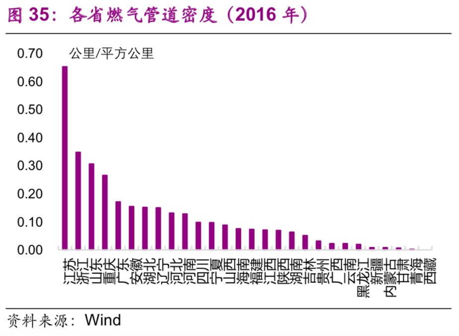 管道長度遠低于美國等國家。2016年,中國的管道長度為12.6萬公里,大幅低于美國(222.5萬公里,2013年數(shù)據(jù))、俄羅斯(26.0萬公里,2007年水平)(圖20)。從密度和人均水平上來看,2016年中國管道密度為0.013公里/平方公里,與日本(0.013公里/平方公里)、俄羅斯(0.016公里/平方公里)相當,但遠低于美國(0.24公里/平方公里)、英國(0.16公里/平方公里)等西方發(fā)達國家(圖9);