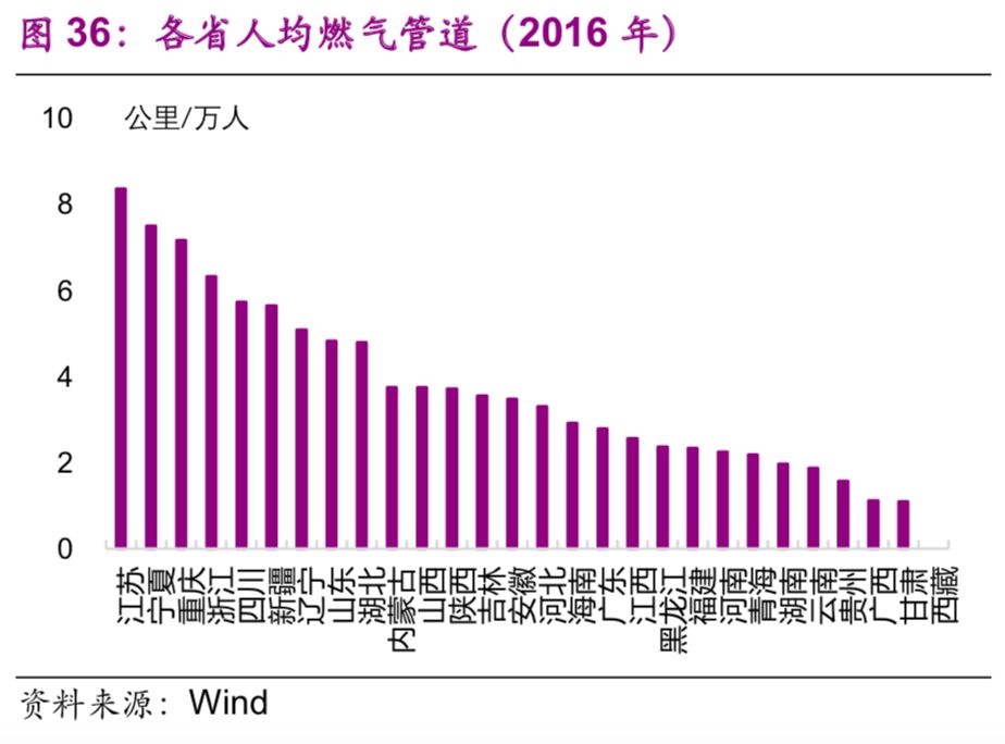 能源基礎(chǔ)設(shè)施方面,東部地區(qū)普遍高于中西部地區(qū)。2016年,燃氣管道密度排名前三的是江蘇(0.65公里/平方公里)、浙江(0.35公里/平方公里)、山東(0.31公里/平方公里)(圖35);人均燃氣管道[22]排名前三的也是浙江(8.4公里/萬人)、寧夏(7.5公里/萬人)、重慶(7.2公里/萬人)(圖36)。