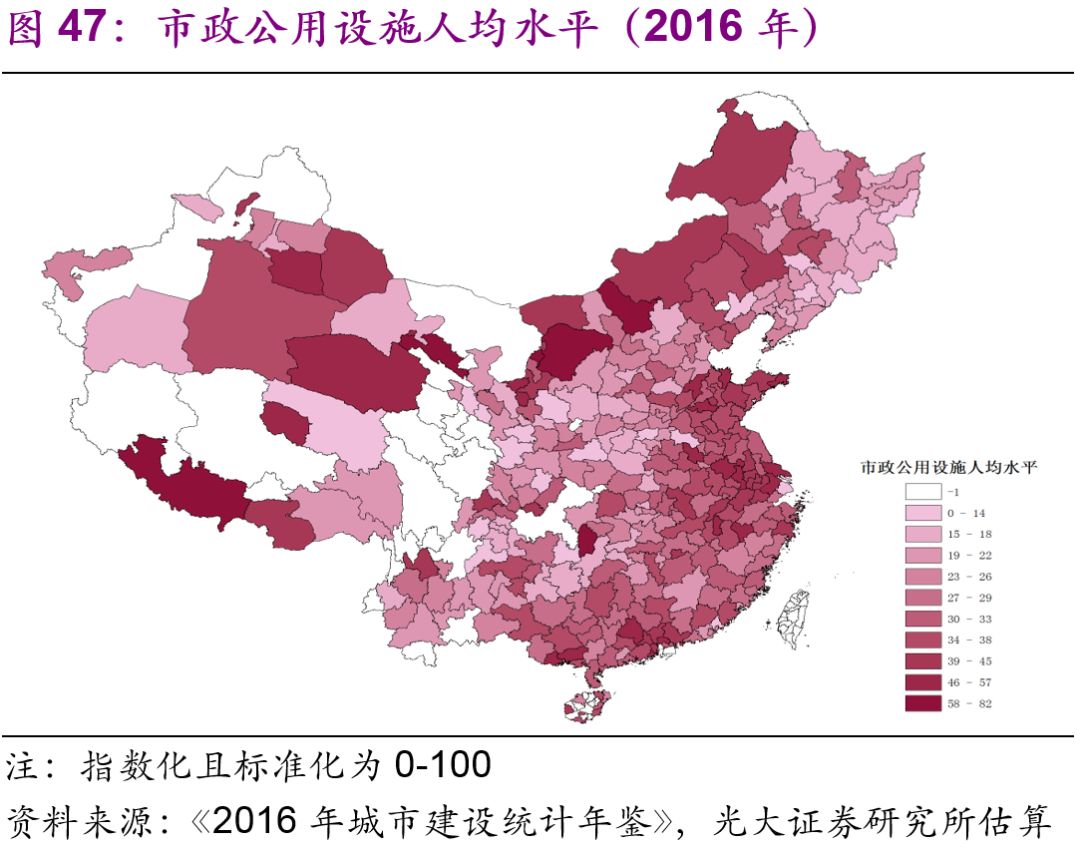 城市市政公用設(shè)施投資結(jié)構(gòu)不斷變化。隨著中國城鎮(zhèn)化的不斷推進,2016年投資額達1.7萬億元的城市市政公用設(shè)施投資結(jié)構(gòu)有了較大變化:1990年占據(jù)較大比重的燃氣(16%)、供水(20%)隨著滲透率觸及“天花板[26]”后比重下降較快,兩者2016年的比重分別為2%、3%;而更能體現(xiàn)城市功能升級的公共交通、道路橋梁等的比重上升較快,1990年兩者的比重分別為8%、26%,2016年則分別為23%、43%;此外,許多新型的城市市政公用設(shè)施投資開始出現(xiàn),例如地下綜合管廊,2016年占比達到了1.7%(圖44)。