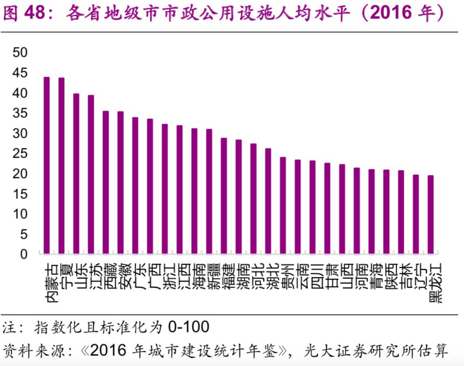 歷史上城市市政公用設(shè)施投資增速與總體基礎(chǔ)設(shè)施建設(shè)投資增速相關(guān)性較高,但近年來分化加大。而2014年開始實行的規(guī)范地方政府債務(wù)的一系列舉措使得當年的城市市政公用設(shè)施投資增速轉(zhuǎn)負,2014、2015年的增速分別為-0.63%、-0.25%,直到2016年才轉(zhuǎn)正。而城市市政公用設(shè)施投資占總體基礎(chǔ)設(shè)施建設(shè)投資的比例則不斷下降,2016年僅為11.5%,較2003年的高點(32.6%)下降了21個百分點(圖43)。